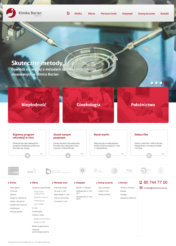 Nowoczesna strona wykonana dla kliniki, która specjalizuje się w dziedzinie leczenia niepłodności, ginekologii oraz położnictwa. Należy ona do elity placówek zajmujących się leczeniem niepłodności w Polsce. Pozycja tej kliniki poparta jest bardzo wysoką skutecznością leczenia oraz systematycznie wzrastającą liczbą pacjentów zgłaszających się do kliniki.
